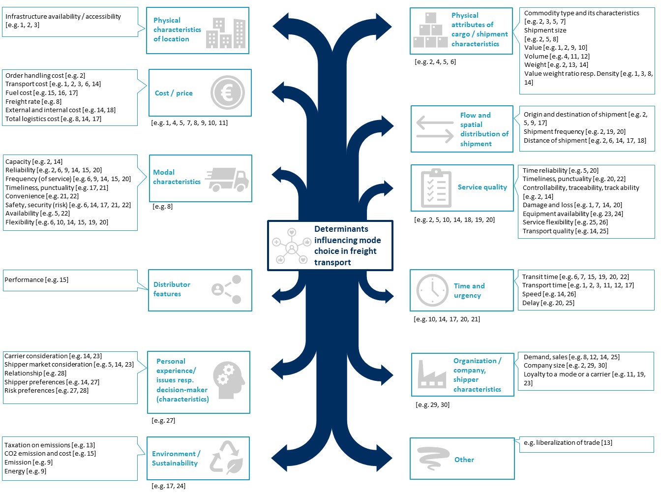 The determinants are grouped in 12 categories: physical characteristics of location, physical attributes/ characteristics of cargo / shipment characteristics, cost / price, flow and spatial distribution of shipment, modal characteristics, service quality, distributor features, time and urgency, personal experiences/ issues resp. decision-maker (characteristics), organization / company, shipper characteristics, environment / sustainability and other.